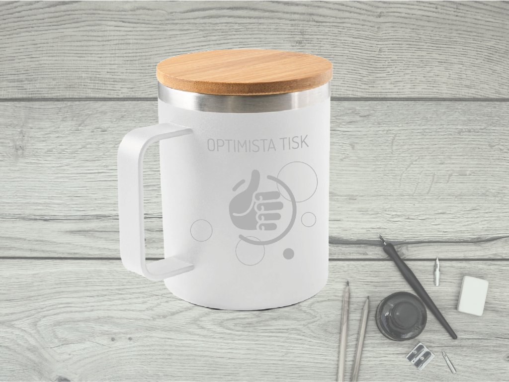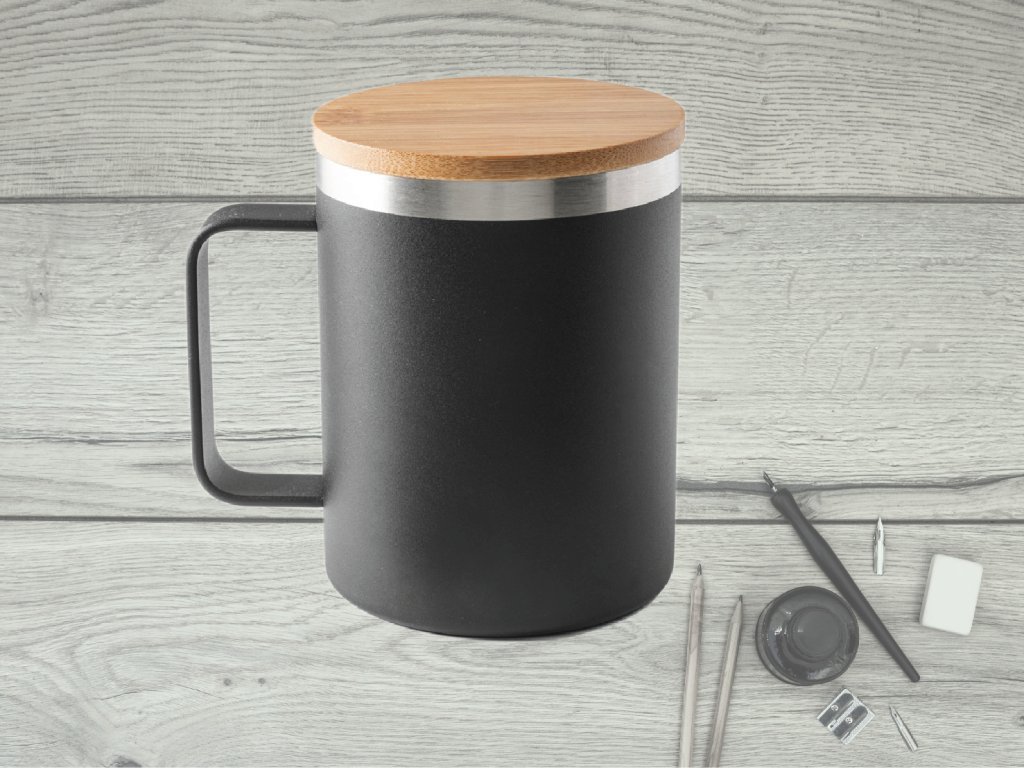 Hrnek z nerezové oceli (90 % recyklované oceli) s bambusovým víčkem a vakuově izolovanou dvojitou stěnou. Tento hrnek má práškový lak, díky kterému je odolnější a trvanlivější. Objem až 420 ml. Dodává se v dárkové kraftové krabičce. Protože je výrobek vyroben z přírodních materiálů, barva a velikost výrobku a výsledek tisku se mohou u jednotlivých výrobků lišit. ø88 x 112 mm. Vhodné pro mytí v myčce.