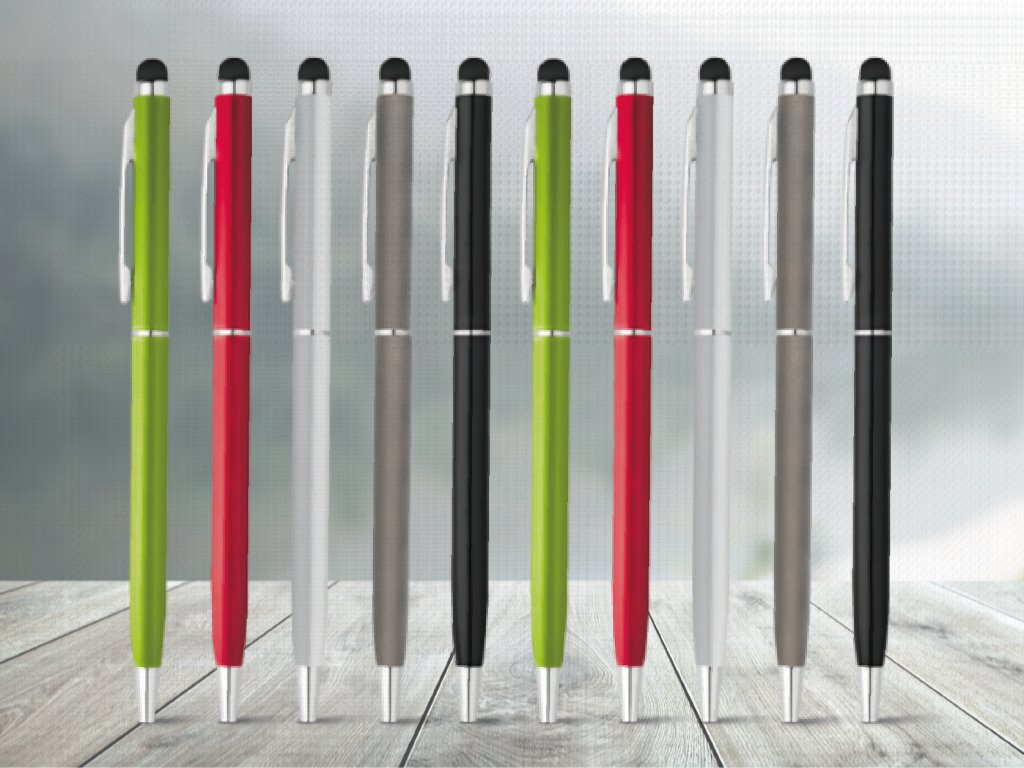 Hliníkové kuličkové pero s otočným mechanismem a dotykovým hrotem. Maximální velikost potisku je vpředu 55 x 6 mm.